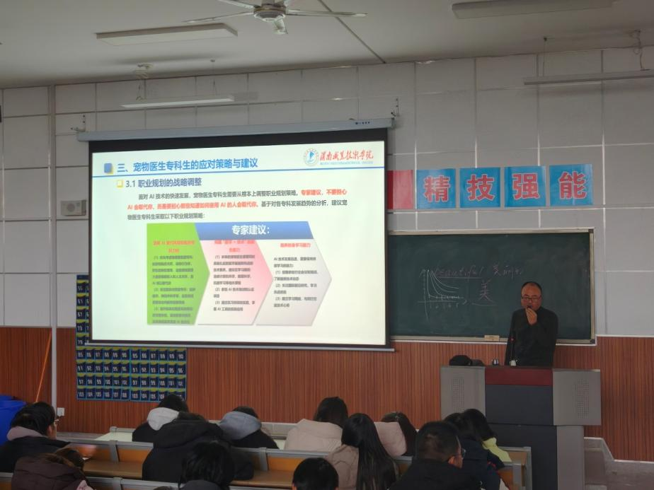 宣讲中,张勃伟首先就党的二十届四中全会精神进行了解读。党的二十届四中全会强调,抓住新一轮科技革命和产业变革历史机遇,统筹教育强国、科技强国、人才强国建设,着力增强自主创新能力、催生新质生产力,同时明确了“十五五”时期发展目标。提出要办好职业教育、大力培养高技能人才,这一部署与动物医学、宠物医疗专科教育的发展需求高度契合,为专业人才培养和行业发展指明了清晰方向。